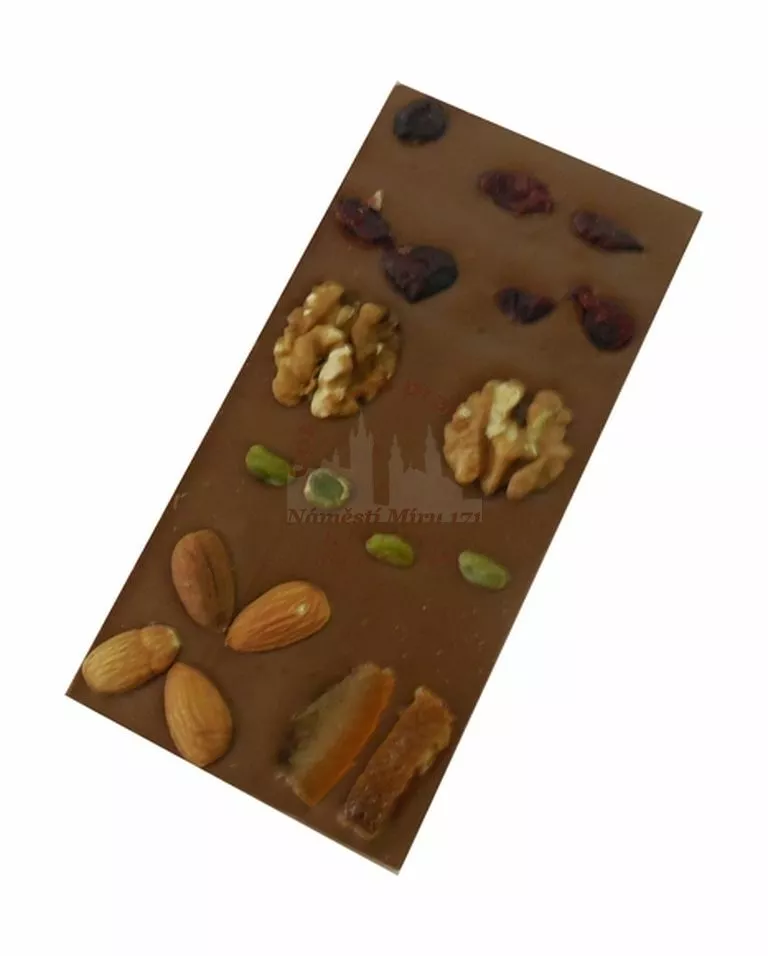 Složení: obsah kakaa min 33,6%, cukr, kakaové máslo, sušené polotučné mléko, kakaová hmota, emulgátor: soja lecitin, přírodní vanilkové aroma, suché plody (vlašské ořechy, mandle, pistácie, kustovnice, rozinky, pomerančová kůra).Obsah kakaové hmoty nejméně 33,6%.