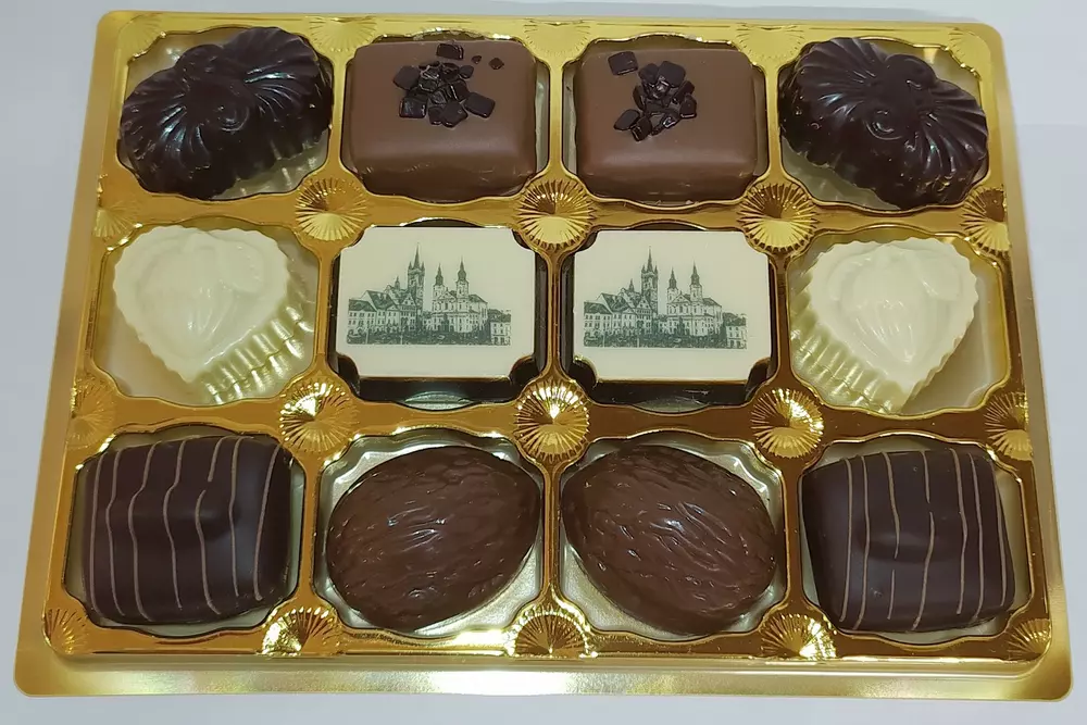 Dárková kazeta plněná pralinkami - směs 12 ks pralinek s celkovou minimální hmotností 135 gramů.