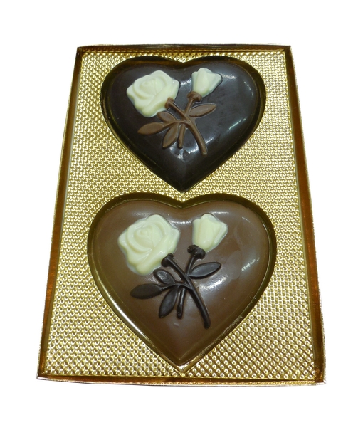 Tvarovaná belgická čokoláda ve tvaru srdíčka. Váha cca 150 gramů. 2 ks srdíček v kazetě - mléčná / hořká čokoláda.