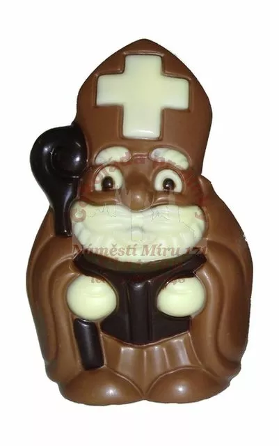 Figurka z mléčné belgické čokolády (zdobená bílou a hořkou). Váha cca 50 gramů. Výška 10 cm.