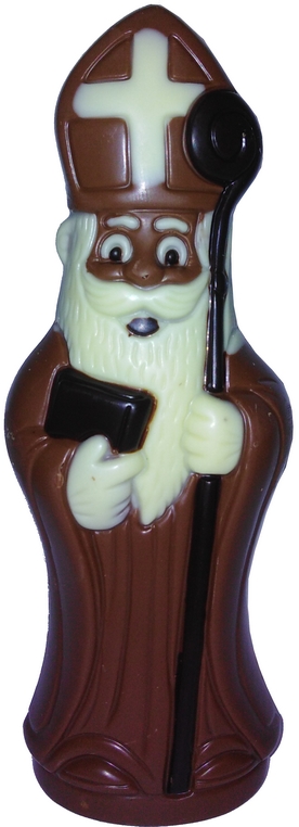 Figurka z mléčné belgické čokolády (zdobená bílou a hořkou). Váha cca 100 gramů. Výška 15 cm.