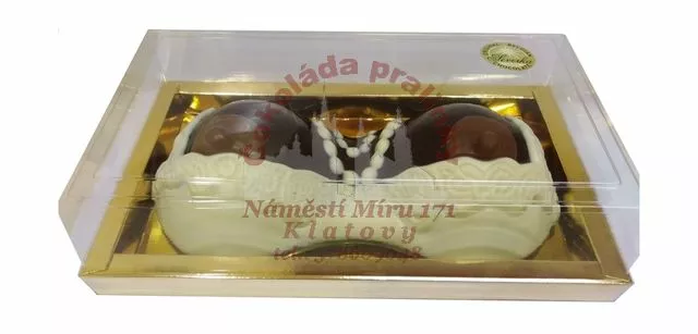 Figurka z hořké belgické čokolády (zdobená bílou a mléčnou). Váha cca 440 gramů. Šířka 28 cm.