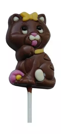 Čokoládové lízátko ve tvaru kočičky na tyčce, váha 35 gramů, výška čokolády 8 cm.