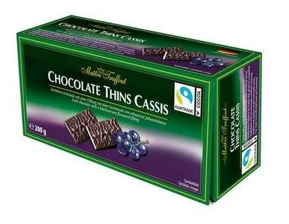 Hořká čokoládové plátky plněné černorybízovým fondánem