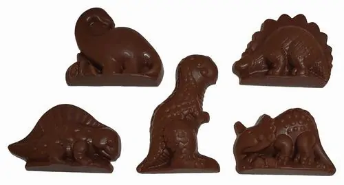 Dinosaurus z belgické mléčné čokolády. Tvarovaná čokoláda. Váha 13 gramů. Pět motivů.