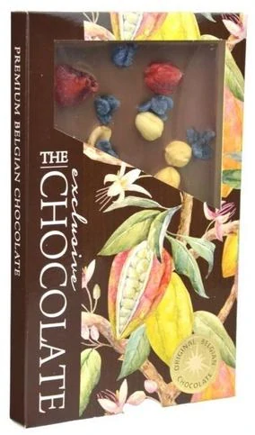 Tabulka z mléčné belgické čokolády s lískovými ořechy, třešněmi a fialkami. Váha 145 gramů.